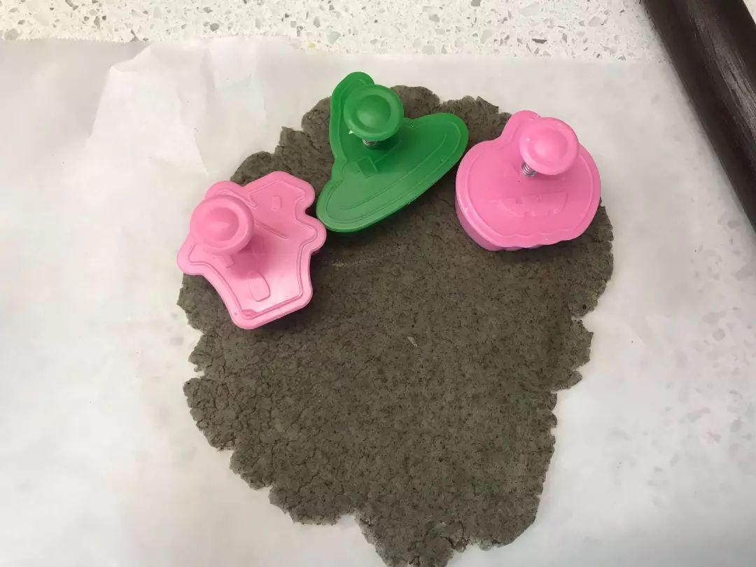 4,冷藏过的面团,用擀面杖擀成一个硬币的厚度的面片,用模具摁出图案