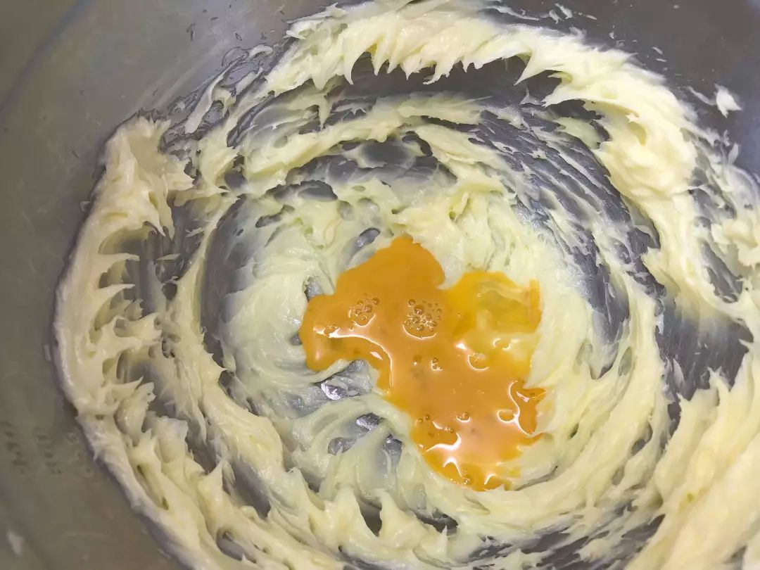 2,分三次将全蛋分批加到黄油里面,没加一次都要搅拌均匀,避免水油分离