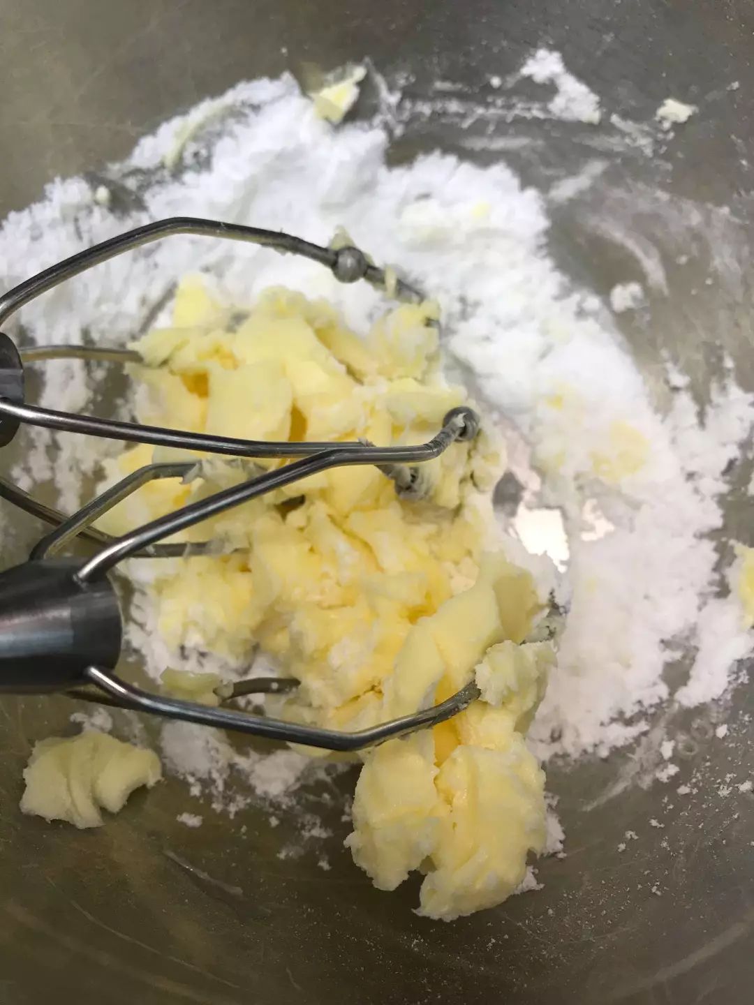 1,黄油室温融化,放入木糖醇,搅打到黄油变软,体积膨大,颜色变浅