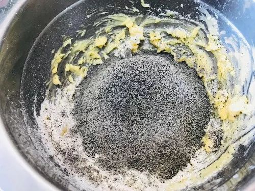 3,将黑芝麻红豆粉和低筋面粉过筛到黄油里,和成面团,放入冰箱冷藏30分钟