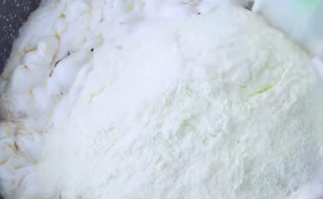 第二步:之后按照下面这张图操作,把奶粉倒入锅中,用塑料锅铲不停翻拌,直至和原来的棉花糖溶液完全融合,看不到粉末状颗粒后关火。