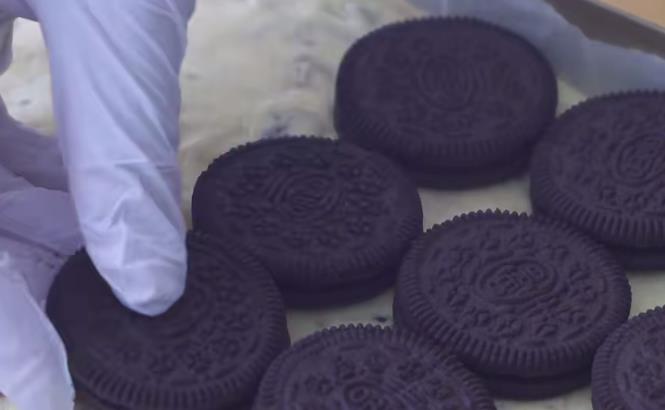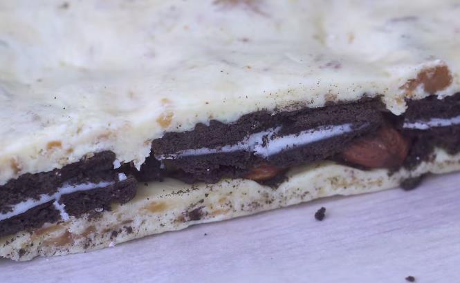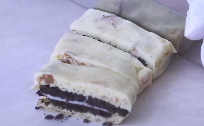 第四步:之后把准备好的奥利奥饼干铺在一半体积的牛扎糖上,然后用另一半牛轧糖覆盖,适当在上面按压紧实,收好四边,等待静置凝固。
