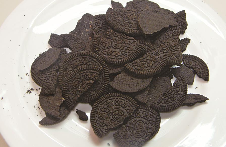 1 奥利奥饼干扳开,取出里面的夹心,仅留饼干。
