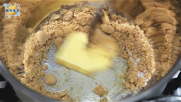 用小火慢慢加热,同时不停地搅动无盐黄油,直接黄砂糖与无盐黄油全完融合在一起。
