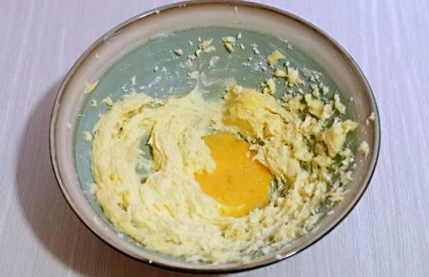 4、将鸡蛋打在碗里,直接将鸡蛋搅拌成蛋液。然后再将蛋液倒在拌好的黄油碗里。但是蛋液不要一下子全部倒进去,最好是分次的加进去。可以先加一半蛋液,然后用打蛋器将蛋液和黄油打至完全融合,接着再加剩下来的一半蛋液,加好之后还是继续的打发。