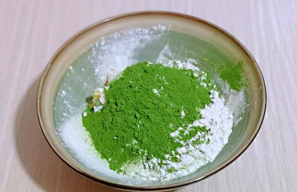 6、等到面粉筛进去之后,接着是将准备好的菠菜粉筛进去。