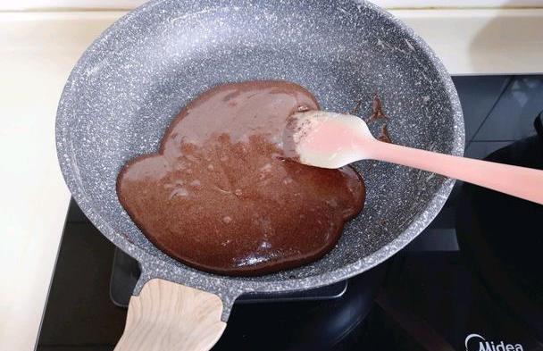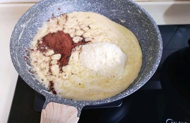 炒到锅里的棉花糖全部融化之后,开始将准备好的可可粉加进去,还有奶粉也要一起加进去。