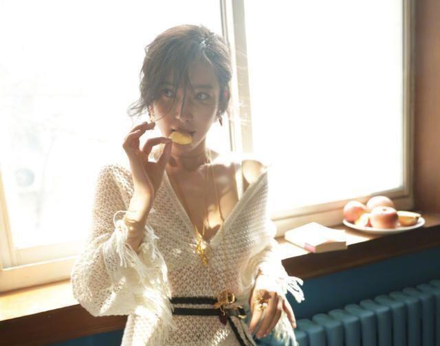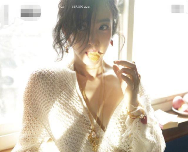李冰冰:晒性感大片,V领镂空上衣朦胧的刘海,嘴含饼干,很抢眼