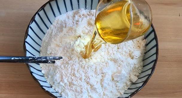 第一步:碗中准备300克普通面粉,再加入65克花生油,充分搅拌均匀。