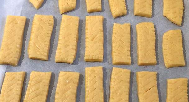 第三步:把揉好的面团擀成长方形的面皮,然后把边缘整理好,切成块状;接着用小刀在上面打上刀花,做成饼干的样子放入烤盘中。
