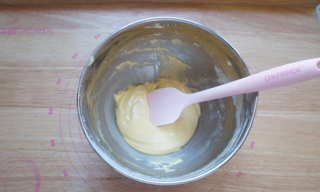 用刮刀翻版均匀,成为光滑有光泽的面糊,如图这样。