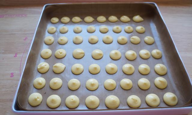 将面糊放入裱花袋,挤到铺了油纸的烤盘里,因为面糊中没有油,因此不沾烤盘也要铺油纸来防粘哦。再放到预热好170度烤箱中的第二层,烘烤18分钟,饼干上色了即可。