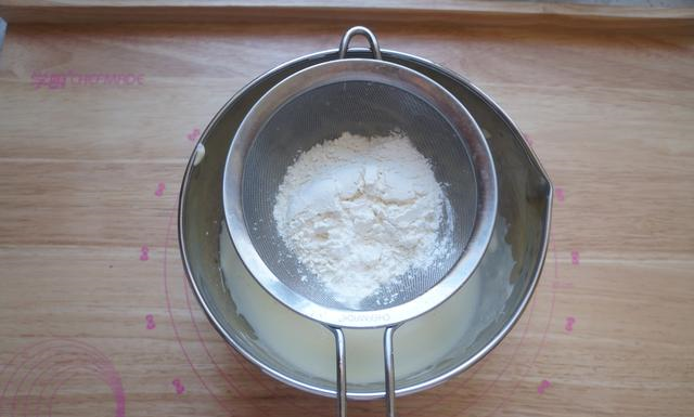 将低筋面粉和玉米淀粉筛入打发好的鸡蛋盆里
