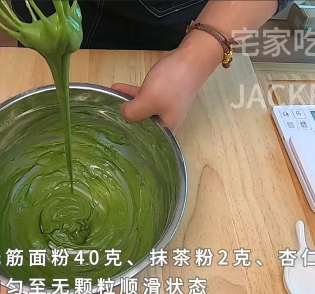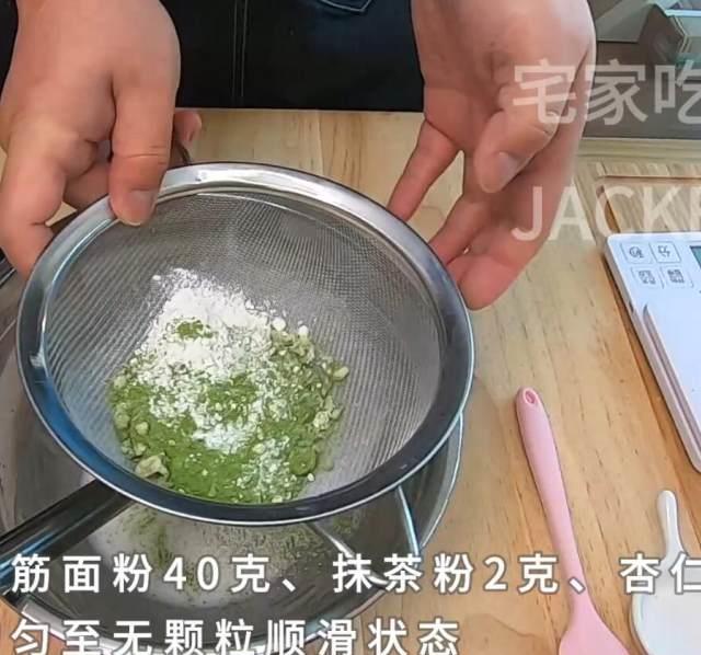 第3步、筛入低筋面粉40克、抹茶粉2克、杏仁粉5克。