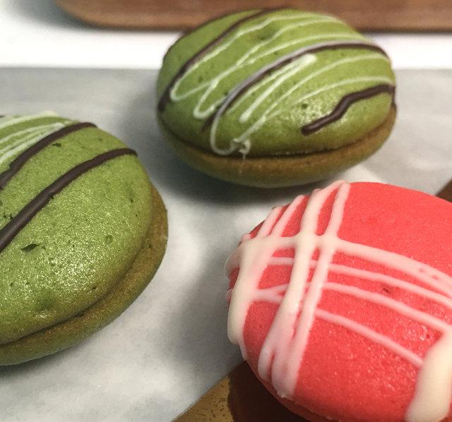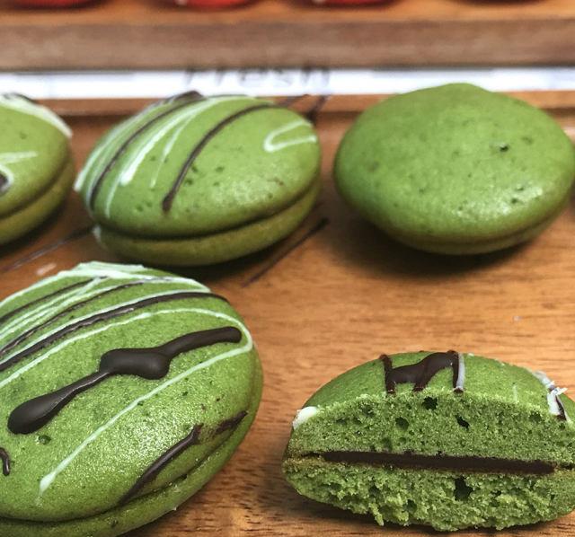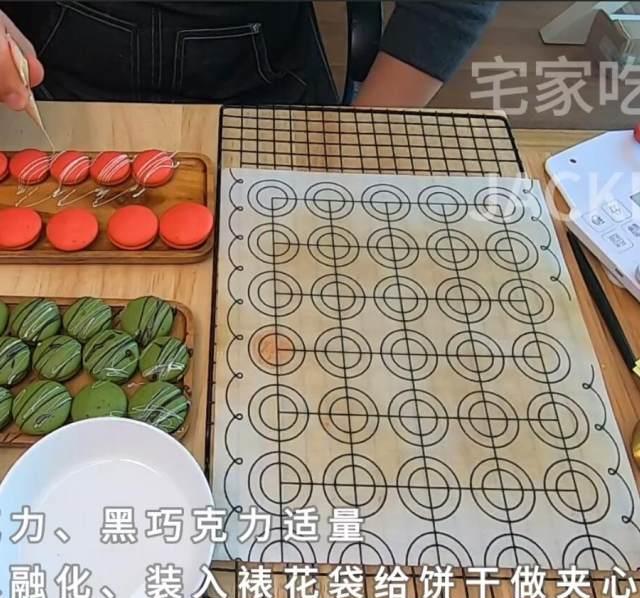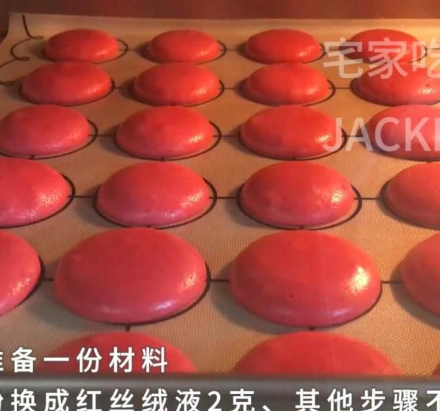原料:蛋白、糖粉、低筋面粉、杏仁粉、无盐黄油、抹茶粉、红丝绒液、白巧克力、黑巧克力。