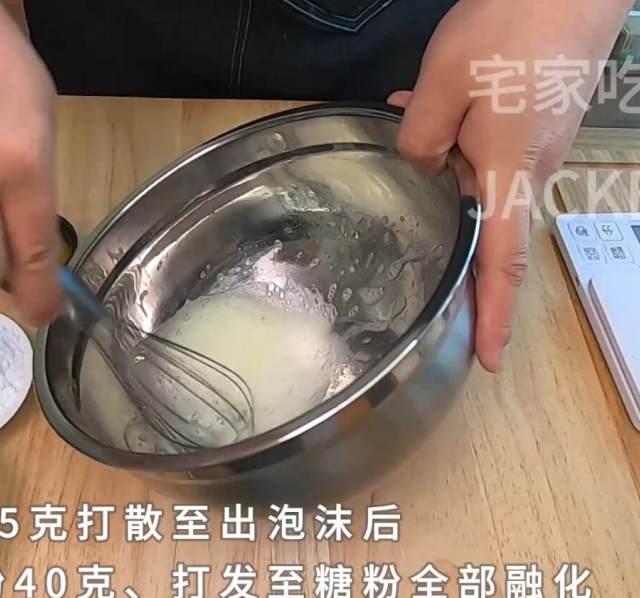 第1步、先取蛋白35克,用手动打蛋器打散至出泡沫。