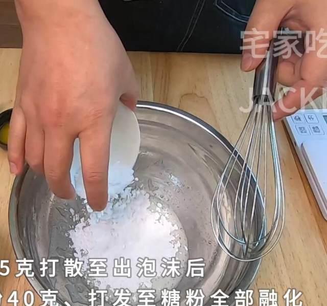 第2步、加入糖粉40克,用手动打蛋器打发至糖粉全部融化均匀。