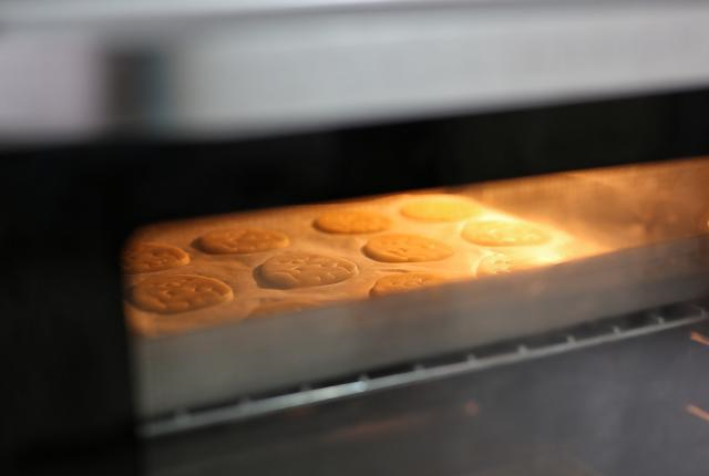 8、最后送入预热好的烤箱中层,上下火140度,烤12分钟左右。温度时间仅供参考,因为每家烤箱温差都不一样,只要烤到饼干边缘略微发黄,就可以出炉了