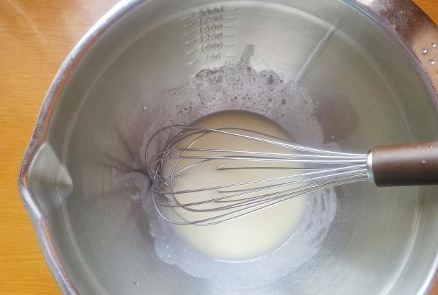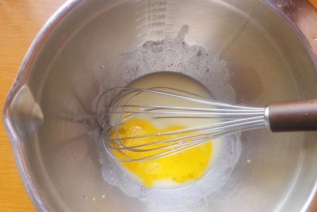 2、然后加入鸡蛋液,继续用手动打蛋器搅打均匀,混匀后再顺着一个方向持续快速搅打约20秒左右,搅打后的液体是比较稠的