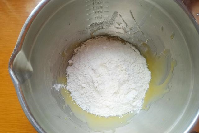 3、再将中筋面粉过筛到盆子里,这里用到的中筋面粉就是日常中做包子馒头用的普通面粉