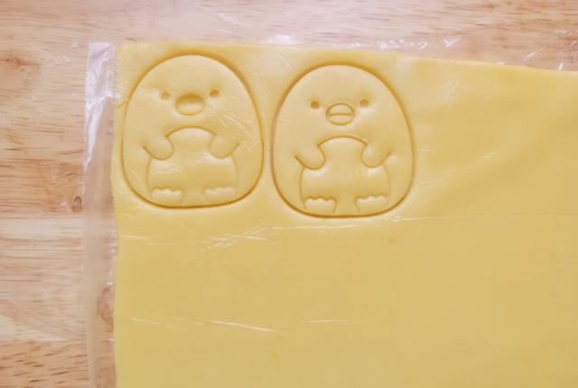 6、取出面片,将保鲜袋用剪刀剪开,然后用自己喜欢的饼干模具,在面片上按压出形状来即可。此时烤箱预热150度上下火