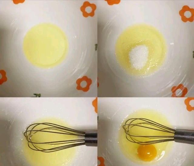 25g玉米油倒入调理盆里,加入25g白砂糖,用打蛋器搅拌均匀,加入一个鸡蛋。