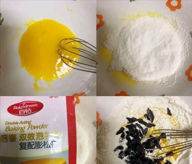 用打蛋器搅拌均匀,筛入50g低筋面粉,1g泡打粉,再加入黑加仑丝。